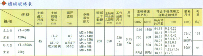 • 產(chǎn)品名稱: YT-4508齒輪式牙距自動攻牙機(jī)